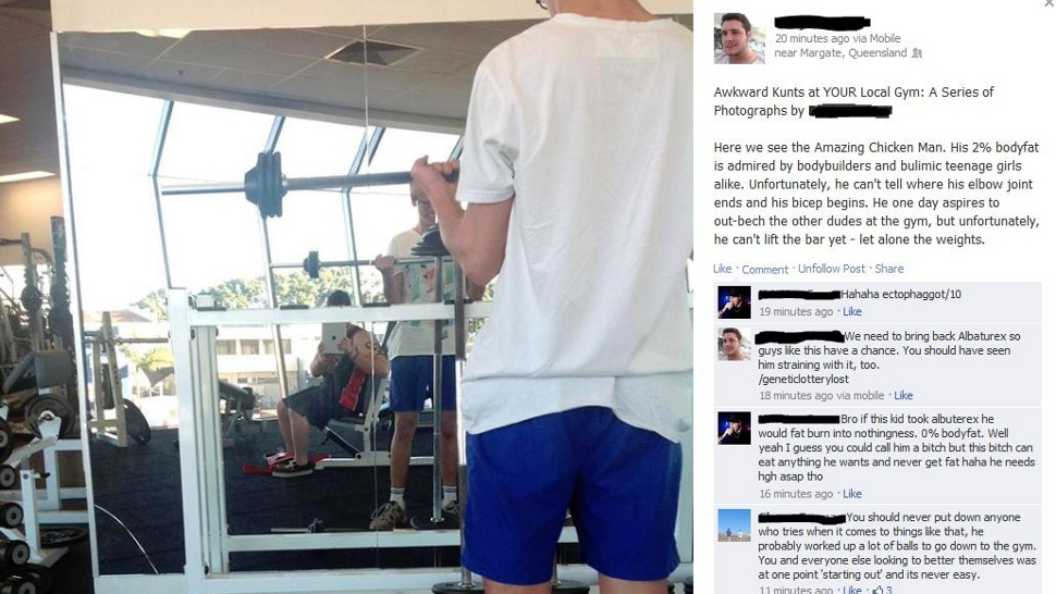 The Internet—aka The Great Democratizer—is at again! This time, a gym bully is getting the shaft. Internet Gets Man Banned from Gym Chain for Mocking Members on Facebook. Some dude thought it would be funny to take pictures of people at his gym and mock them on Facebook. According to the gym owner, his MOM, his Facebook “friends” and the rest of the Internet, he was the only one who found it funny. Below is a screen grab of what this guy did. It should also be worth noting that his mom also cut him off financially after finding out about this. Remember, folks: you can be a dick on the Internet all you want…just be prepared to pay the consequences!