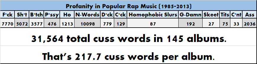 Bitch ass pussy nigga! SKEET! SKEET! Don’t worry. This is relevant to the next story: Genius Andrew Powell-Morse has “scientifically” broken down Profanity in Rap Lyrics Since 1985. Tupac has the #1 and #2 albums with most profanity with All Eyez On Me clocking in at 905 words and Until the End of Time clocking in at 895 words. Less surprising, Too $hort’s Raw, Uncut & X-Rated holds the record for most cuss words per song with 49.8 profanity lyrics in each song. Most profane artist from 1985-2013? Geto Boys! Click the link for a ton more stats. Someone needs to do this for country songs and the use of the words “truck,” “cowboy,” “beer” and “small town.” This won’t work for rock music since rock musicians were actually subtle and poetic in expressing their views.