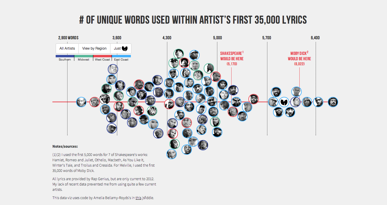If you’ve keeping up with these roundups or listen to the podcast, then it’s no secret that I don’t have much respect for most rap/hip-hop music. I even brought in two East Coast hip-hop artists to persuade me. Spoiler alert: they didn’t. Maybe this chart will do the trick. Some guy really good at making algorithms decided that rather than use his gift of crunching numbers for something that will benefit society, he decided to find out which hip-hop artists have the largest vocabulary. If you want to know the methodology, click the link. Deadline is approaching, and I’m not getting into that. What is noteworthy is the fact that these artists were compared to Shakespeare’s vocabulary, known to be the pinnacle of wordsmiths. To no surprise, DMX was at the bottom, accompanied by Too Short, Drake and 50 Cent. Jay-Z, aka the greatest artist of any art of any time (per Jay-Z), is stuck right in the middle. Maybe it’s because he’s so creative that he can make beautiful poetry with fewer words. Maybe not. Topping the list is Aesop Rock, accompanied by GZA, Kool Keith and Canibus. Yes, someone named Canibus is near the top. I’ll give Aesop Rock a chance. If the Shakespeare of hip-hop can’t convince me that there’s more to hip-hop than sampling others people’s music and yelling eighth grade lyrics over them, than no one will.
