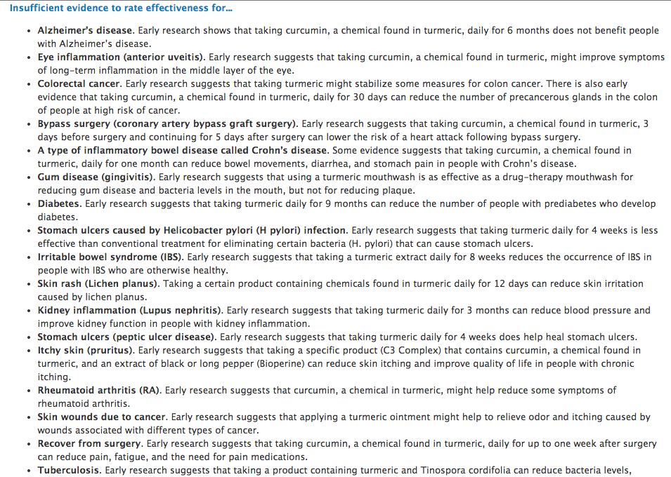 There’s a lot more, but my screenshot only covered that much. Now for a list of what curcumin is effective for: