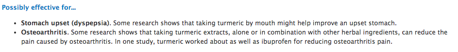 Note the word “possibly.” So if your stomach or wrist hurts, curcumin might or might not do something.