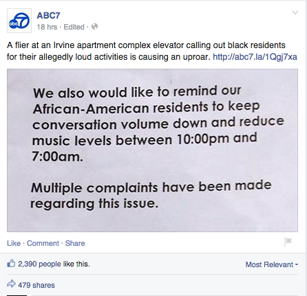 The story: A resident of an Irvine, Ca. apartment complex saw a letter from management that basically tells black people to shut up. Said resident posted it on Instagram while saying “This is what it means to be black in Irvine.” It inevitably goes viral and a racism shit storm ensues.