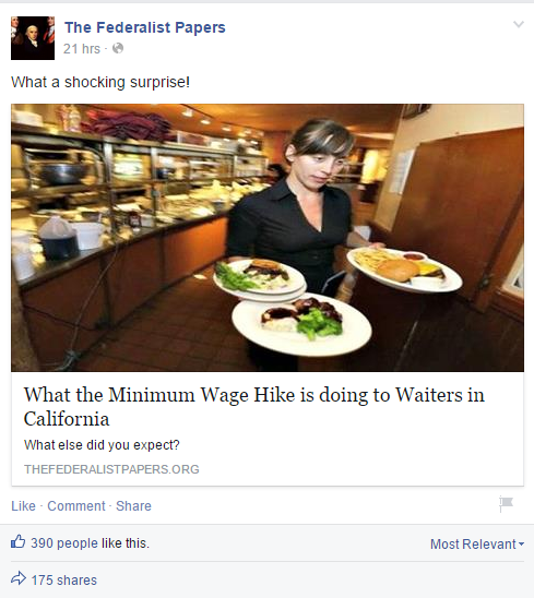 The reality: Essentially, this is going to be a minimum wage debate. Like clockwork, people on the left are for it and those on the right are against it. Even economists can’t come to a common consensus about the issue (actually, most are in favor of increasing the minimum wage). To make this easier (and in true spirit of Facebook Fallacies), let’s focus on the arguments presented by the above article.