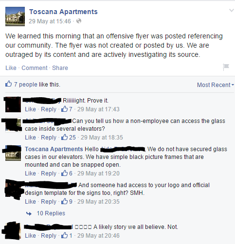 Management claims that they did not post the flier featured in the Instagram video. As you can tell from the comments, no one believes their claim. Even after poking holes in arguments dealing with glass cases and cameras, people still refused to believe apartment management. Even with empirical evidence, you cannot change someone’s mind once they have already reached their own conclusion. Denialism and ignorance.